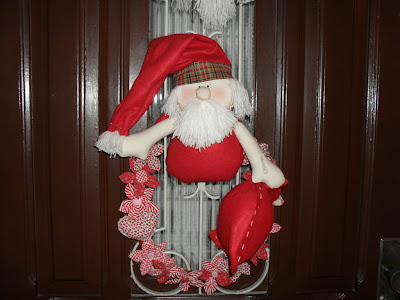 Uns dias atrás mostrei um Papai Noel que eu pretendia prender à uma guirlanda. Fiz uma bem simples, com flores de fuxico:
